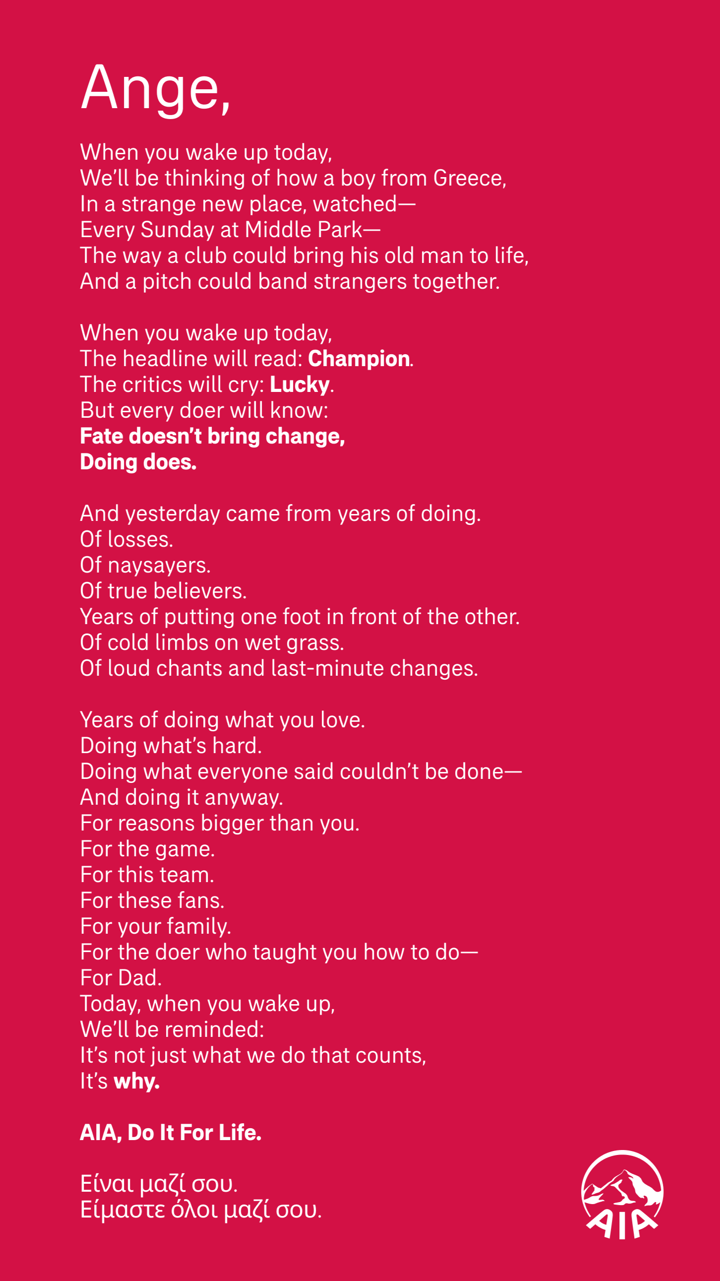 People doubted Ange Postecoglou could lead Tottenham Hotspur to victory, but he didn’t. So after the Spurs’ incredible win over Manchester United in the Euros, AIA Insurance — the team’s lead sponsor — wanted to send a message to Ange and doers everywhere: keep showing up, no matter the odds.